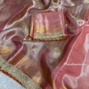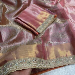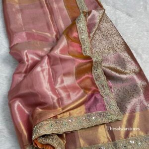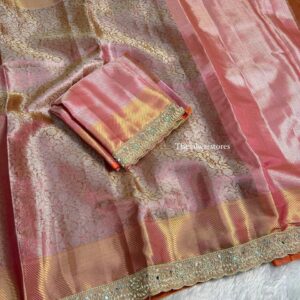 Pink Banarasi Kanchipuram Tissue Silk Saree Shimmer in this affordable Pink Banarasi Kanchipuram Tissue Silk Saree! This luxurious 5.8-meter saree and its 1.5-meter matching blouse material feature an intricate floral jacquard weave paired with bold gold zari stripes. The opulent look is completed with a stunning pearl and mirror work lace border, offering an elegant finish.