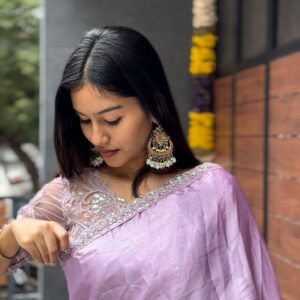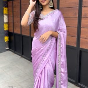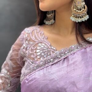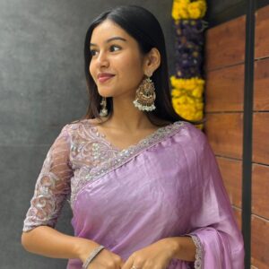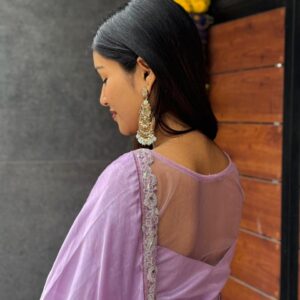 The Sivya Saree is a dreamy lavender chiffon saree curated to give a premium festive look at an affordable range. It drapes beautifully, feels soft and lightweight, and features a finely detailed lace border with elegant silver embroidery that adds a graceful shine.