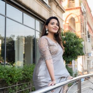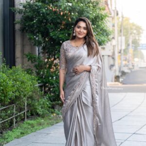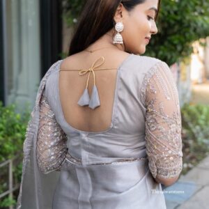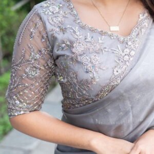 The Sylvia exudes ethereal grace with its lustrous silver-grey drape that flows like liquid moonlight. The look is defined by its stunning blouse, featuring intricate floral stone work and sheer sleeves that add a touch of dazzle. Perfect for cocktail parties, wedding receptions, and evening galas, this ensemble promises effortless sophistication.